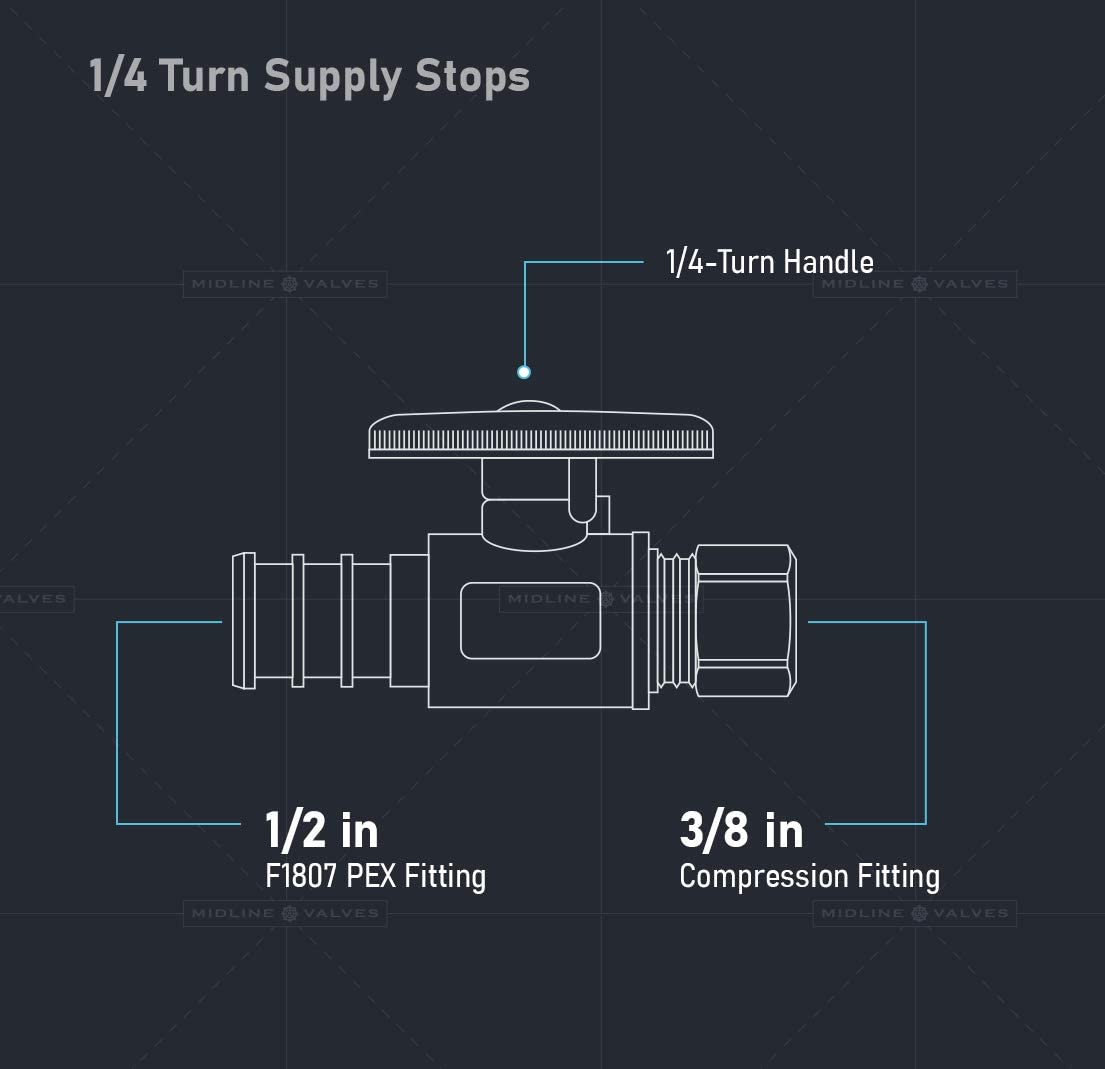 - UNIVERSAL FIT: Water Supply Straight Shut Off Valve Features Standard 1/2 in. PEX x 3/8 in. COMP Connections to Fit all Your Toilets, Sinks, Washing Machine, Water Heater, Dishwasher, etc.