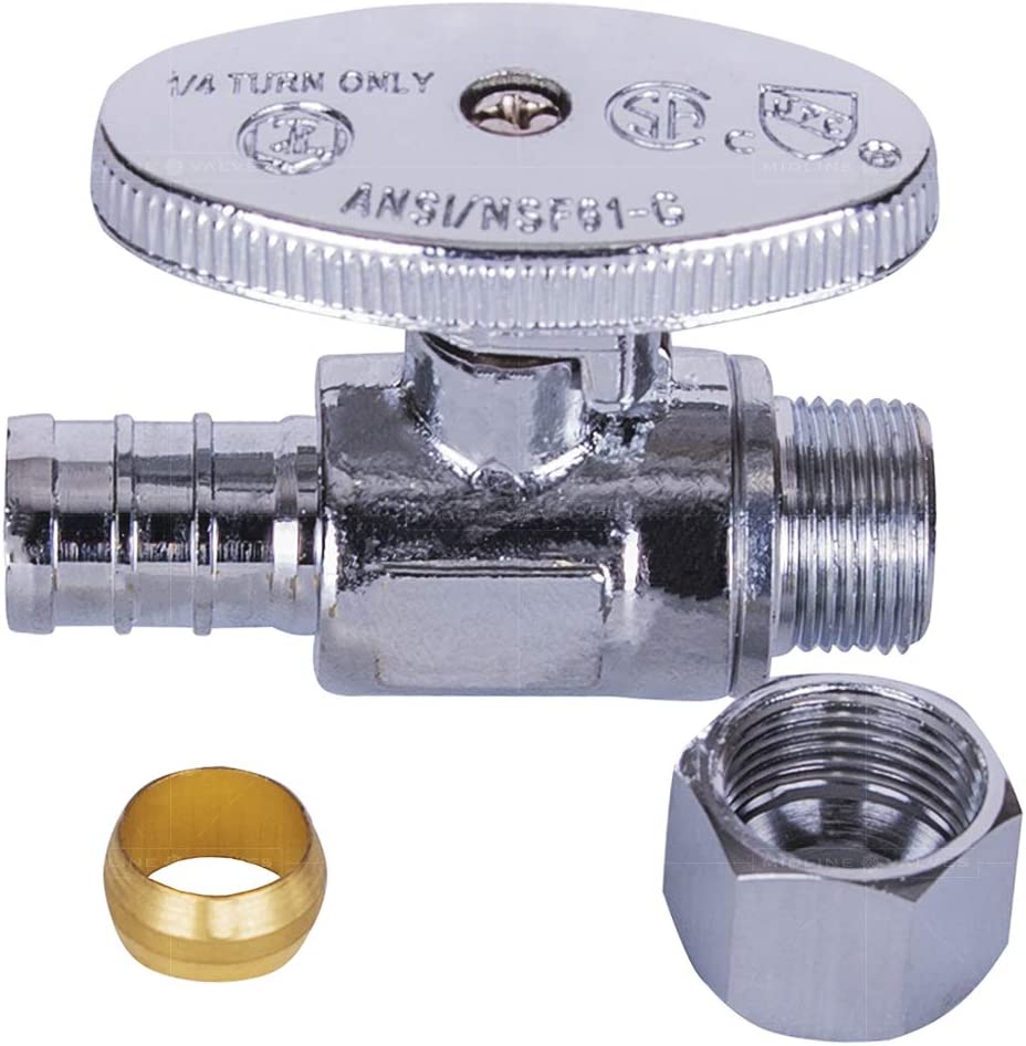 1/2 Inch Pex X 3/8 Inch Od Comp. Quarter Turn Straight Stop Valve - Premium - Lead Free, Approved By UPC, NSF, Chrome-Plated Brass Body and Tube, And Individually Boxed.