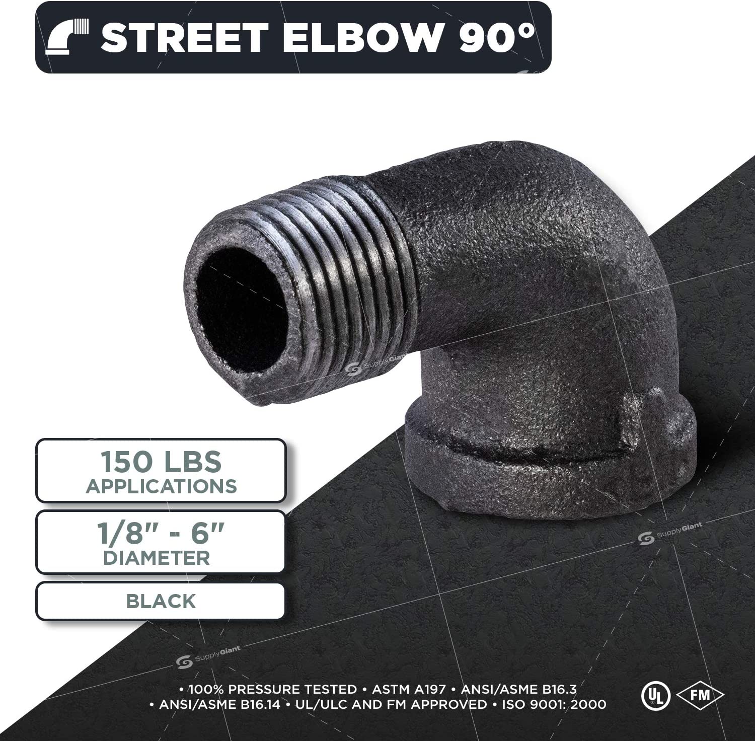 This is an Everflow Supplies street elbow, with 90 degree bend and with 1-1/2 female to male threaded ends. The part is made of malleable iron, with a black finish, and is designed for applications where the pressure does not exceed 150 lbs. The part is produced in an ISO 9001:2000 qualified production environment and it has been pressure tested in the factory. The fitting complies to the ANSI/ASME B16.3 and B16.14 and to the ASTM A-197 standards. It is approved by UL/ULC and FM.