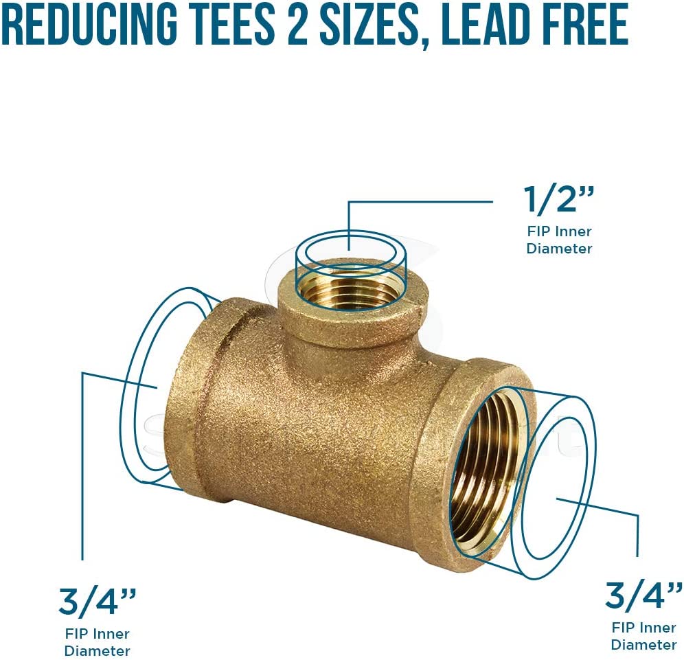 3/4 X 1/2" Brass reducing tee is a class 125 lead free brass pipe fitting with female National Pipe Taper (NPT) threads for connecting and branching three sections of pipe or fittings.