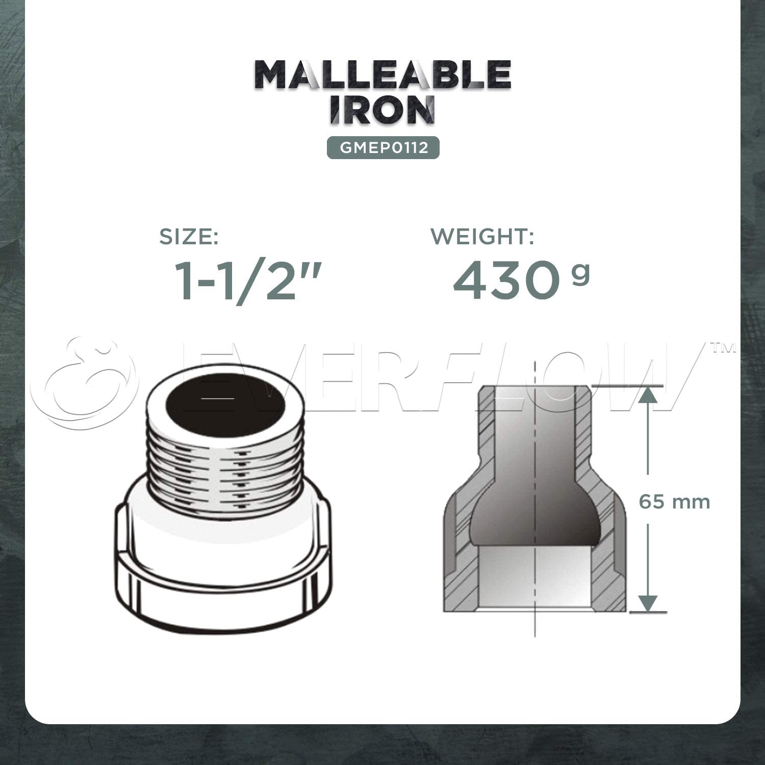 This is an Everflow Supplies extension fitting for elongating pipes, in applications where the pressure does not exceed 150 lbs. In particular, the malleable iron construction has been galvanized to give it additional strength and corrosion protection, giving it improved durability characteristics. Furthermore, the size of the connects of this fitting are 1-1/2 inch for both the female and the male threaded connect. Also, this part has been 100% pressure tested in its manufacturing facility, which is an ISO 9001:2000 certified production environment. In addition, meeting the ASTM A-197 and the ANSI/ASME B16.3 and B16.14 standards, the design of the fitting has been approved by UL/ULC and FM.