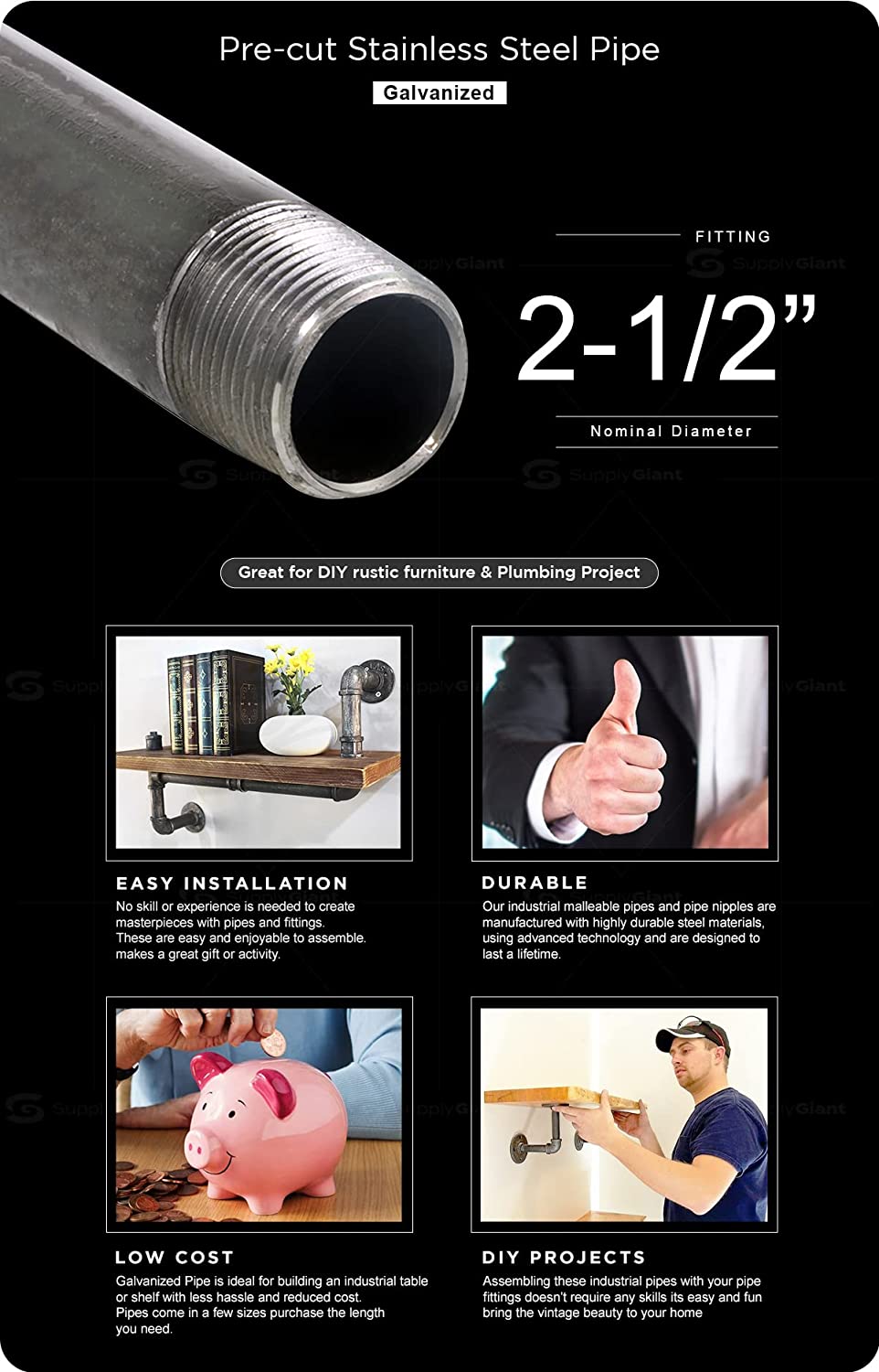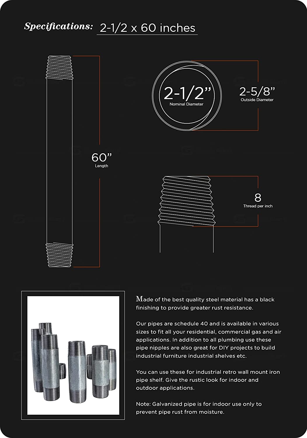 Everflow Supplies PCGL2560 60" Long Pre-Cut Galvanized Pipe with 2-1/2" Nominal Size Diameter