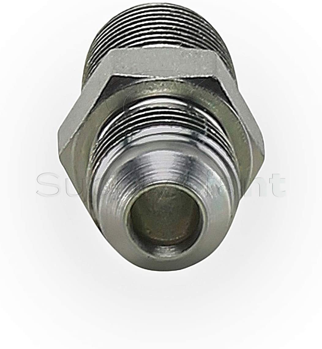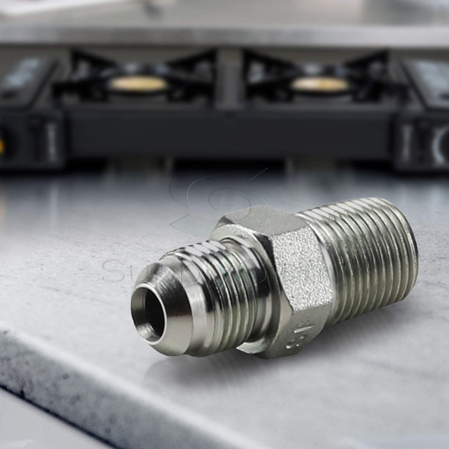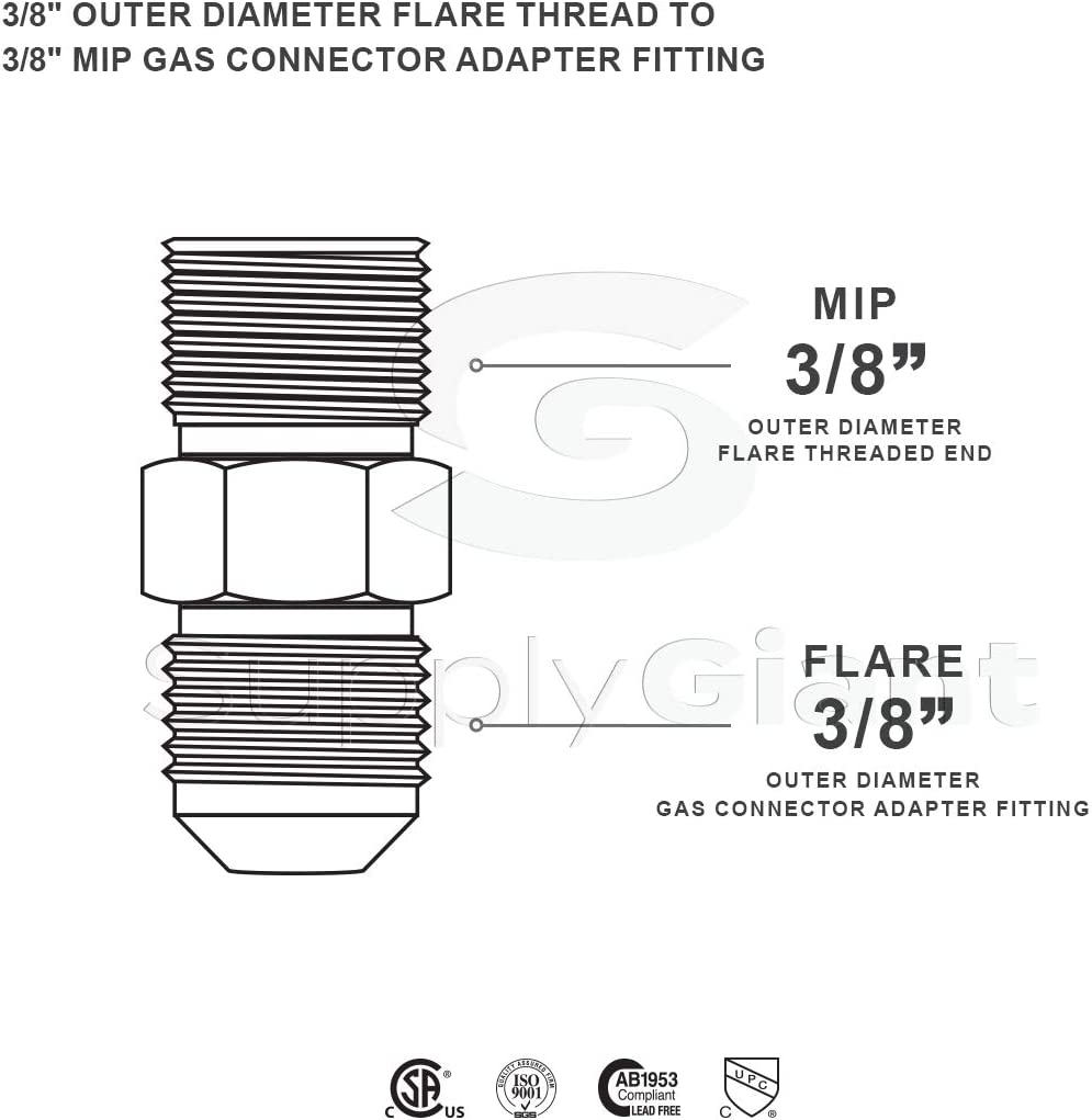 The Flextron Steel Male gas fitting adapts gas connector nut to appliance inlet or gas supply. These fittings are from FTGC-14 series and manufactured from solid bar stock for a seamless, durable design. The flared end of the fitting connects to the gas connector nut. The male end connects to the gas appliance inlet, gas ball valve or gas supply stub out. Threads create a cold weld with the end of the gas connector, making a strong and leak tight seal. This Fitting is used with 3/8 inch outer diameter flare x 3/8 inch (MIP) male iron pipe (TAPPED 1/4"). Gas connector adaptor fitting for appliances with moderate BTU demands such as a four-burner stove, water heater or dryer.