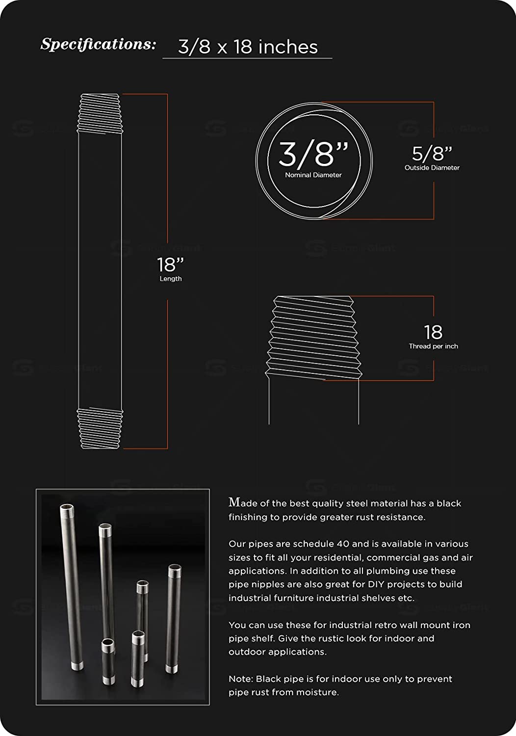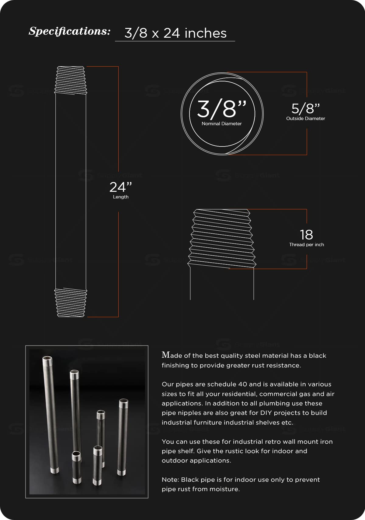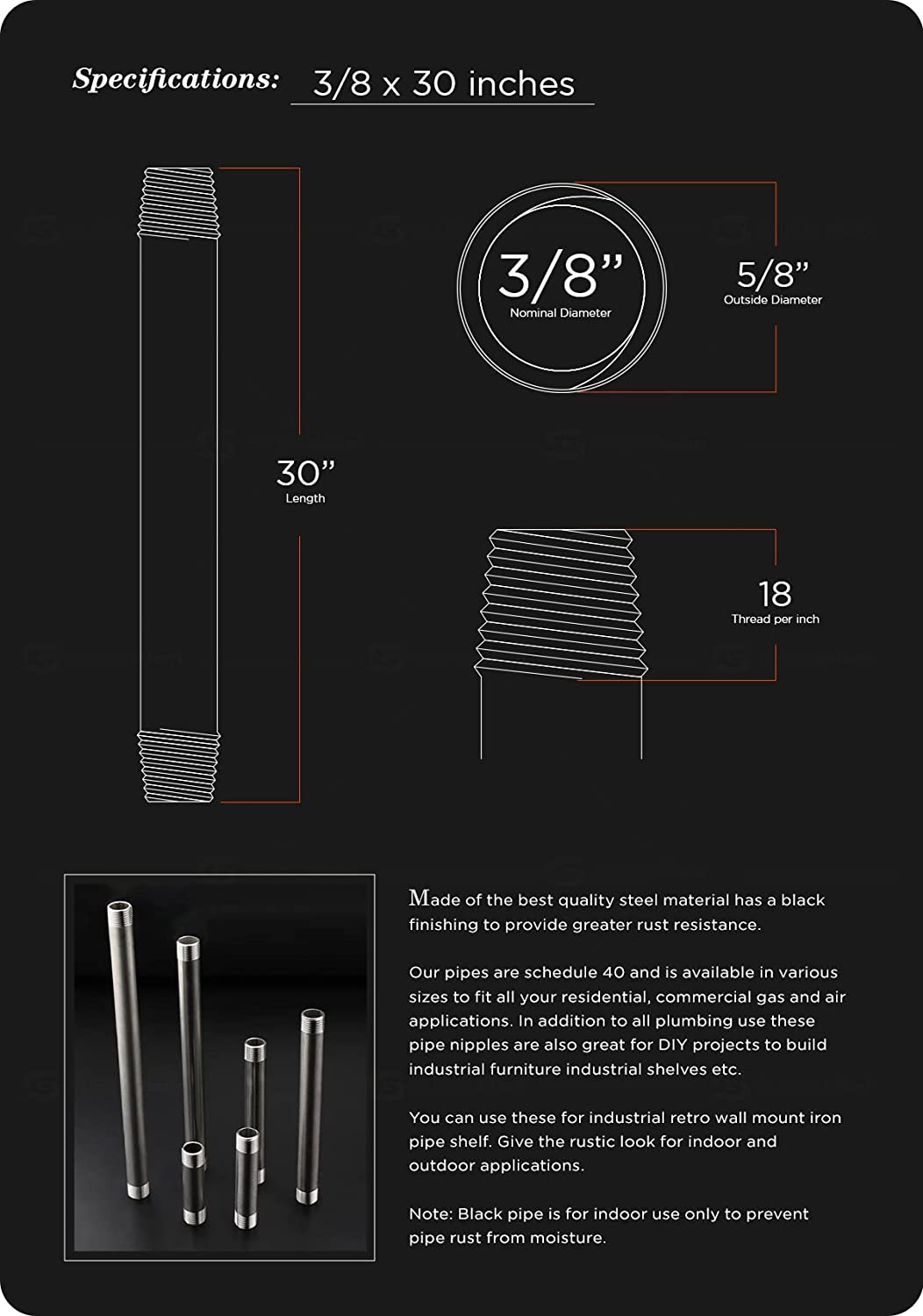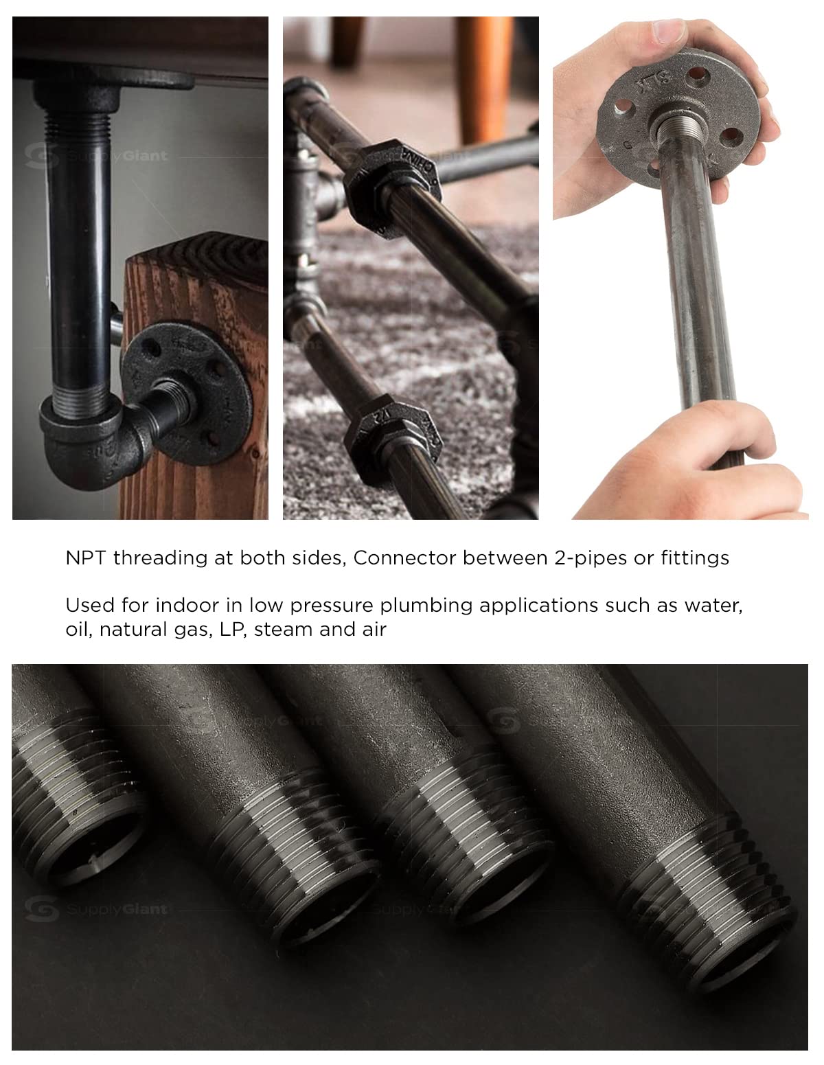 - PIPE TYPE: black pipe 1/2" x 6 feet, male (NPT) National Pipe thread taper made of superior rough coating steel for commercial and residential application